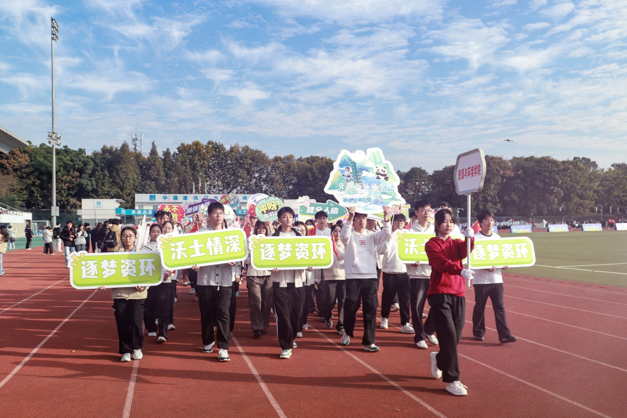 随后,在激昂的背景音乐中,我们运动员方阵昂首阔步向主席台走来。方阵中,部分同学挥舞着鲜艳的五星红旗,红色旗帜在阳光下猎猎翻飞,传递着对祖国的赤诚热爱;另有同学高举“资环逐梦”口号牌,黑色字体遒劲有力,凝聚着资环人奋勇拼搏、追逐梦想的坚定信念。